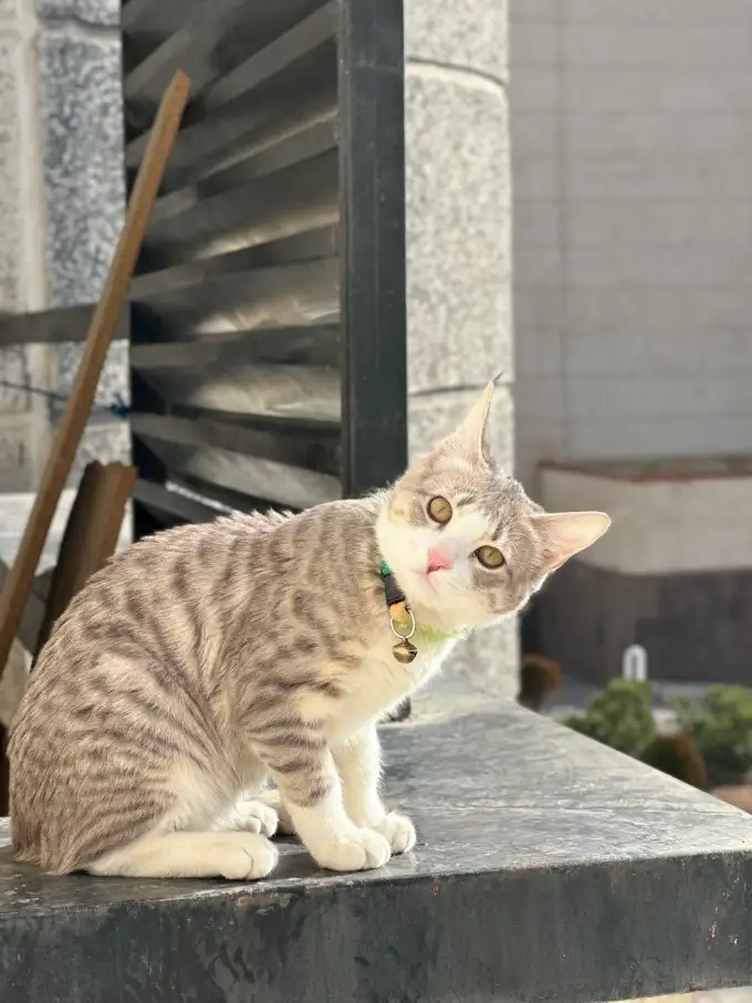 قلاده و زنگوله هم داره ، رنگش طوسی و زیر شکم سفید وکرم تقریبا